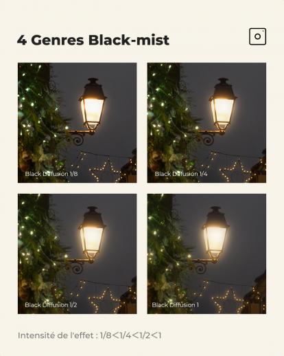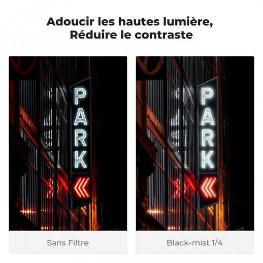 - * 【Éclats de lumière doux, contraste réduit】Ce filtre à brume noire 1/4 adoucit les rides, les taches de rousseur et les pores de la peau du visage, la rendant plus délicate, rebondie et magnifique. L'effet brumeux est mieux reproduit, mettant en valeur les effets du film.