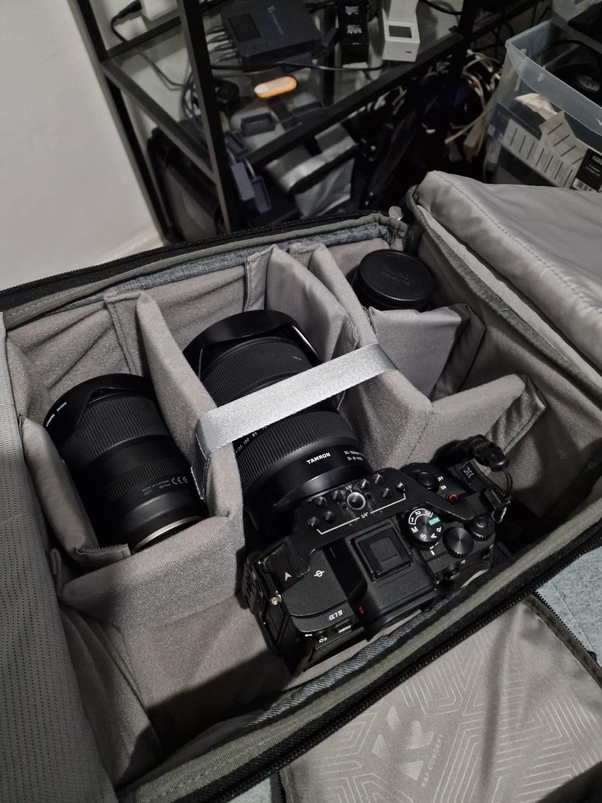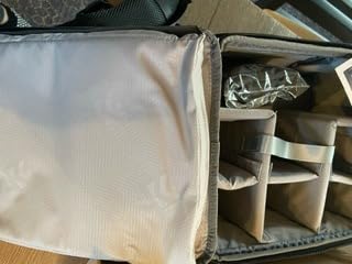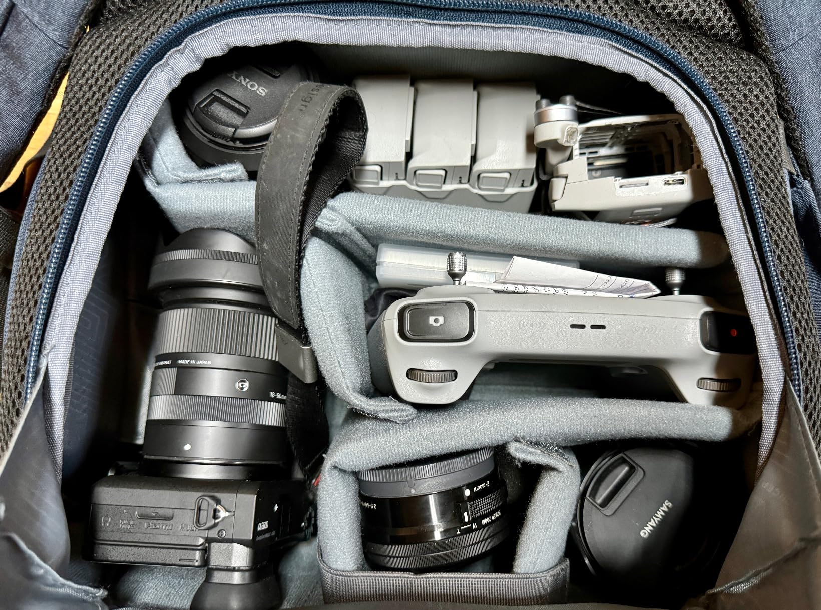 Il y a suffisamment d'espace ici pour un A7iv en cage avec un Tamron 35-150 attaché, ainsi que les Tamron 28-200 et 17-28. J'aurais normalement un DJI Mini 3 Pro, donc je n'aurais pas d'objectifs de rechange, juste le drone et la télécommande, et le sac offre suffisamment d'espace pour ceux-ci.