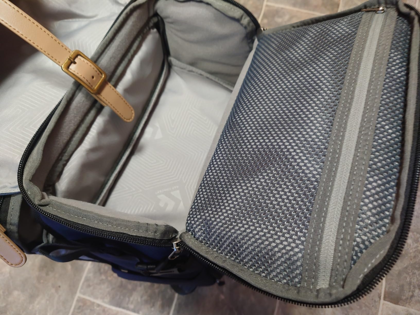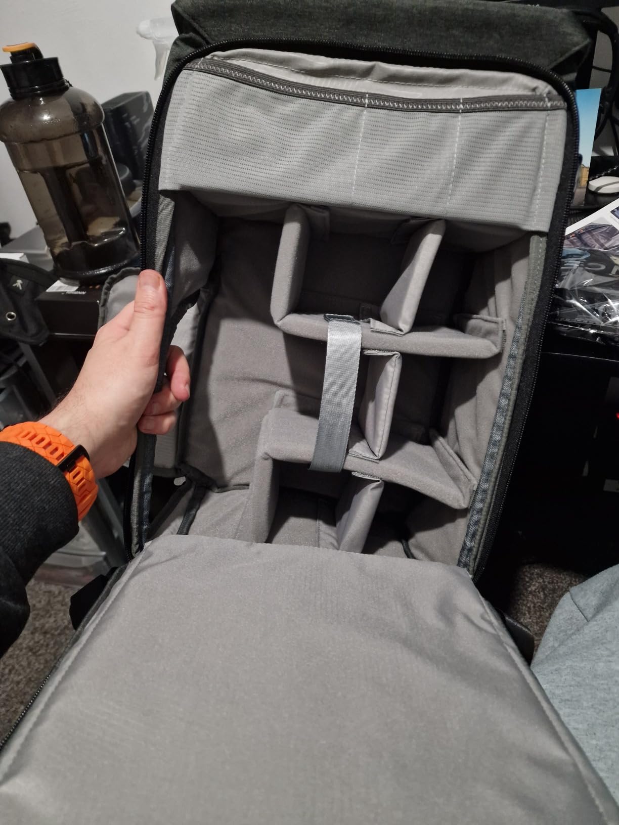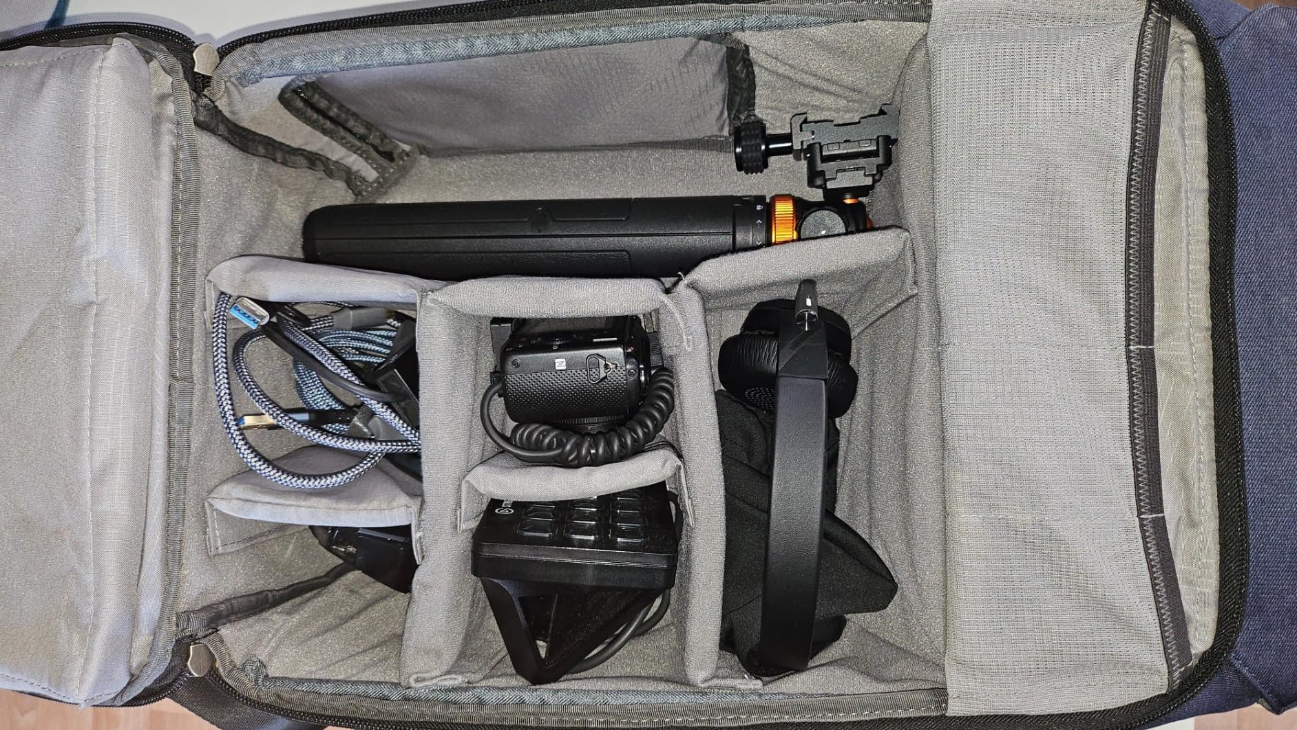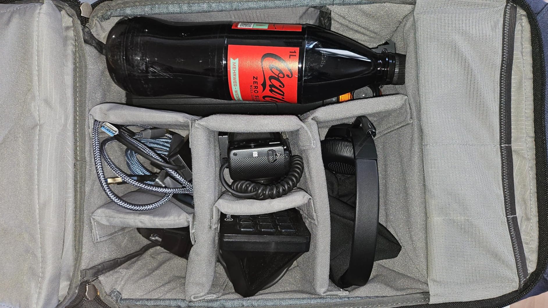 Le compartiment pour ordinateur portable est facilement accessible, vous pouvez facilement ranger une bouteille de cola de 1 l dans le compartiment principal et la retirer simplement via le compartiment à accès rapide. La disposition des compartiments permet de créer un compartiment pour le casque, un compartiment séparé pour tous les adaptateurs, tels qu'une carte de capture USB HDMI, un hub USB, un câble d'extension USB et un câble HDMI, ainsi qu'un compartiment séparé pour la souris et un compartiment pour un simple appareil photo Sony comme une webcam et un lecteur de streaming. Le compartiment supérieur peut contenir une boîte à lunch et de nombreux câbles de recharge, ainsi que les adaptateurs dont vous pourriez avoir besoin.