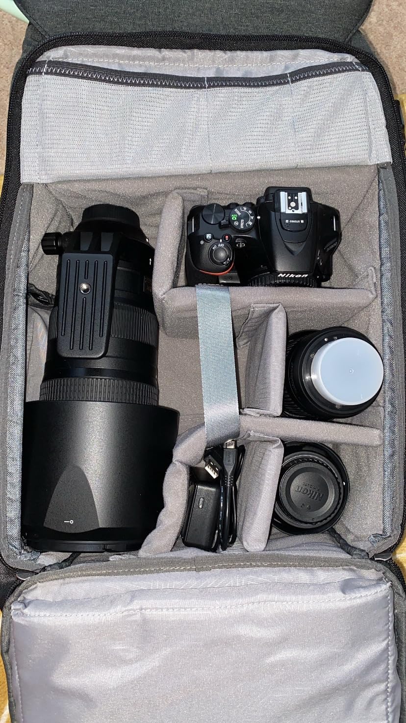 J'avais besoin d'améliorer mon sac photo pour l'adapter à mon objectif Nikon 200-500 mm. Je ne savais pas si c'était le cas, mais comme vous pouvez le voir, c'est le cas (avec le pare-soleil), ce qui le rend beaucoup plus large. Il se place également en haut du sac, sous le rabat, donc si vous avez un objectif animalier plus grand comme le mien, il s'adapte, la qualité est excellente, sur l'image, il semble noir et pas vert forêt mais il est vert, à l'intérieur de la maison, il a l'air noir mais je peux vous assurer qu'il est vert foncé, mon appareil photo sur la photo est équipé d'une prise de batterie et les objectifs sont longs, ce qui vous montre la profondeur du sac (à part mon grand objectif)